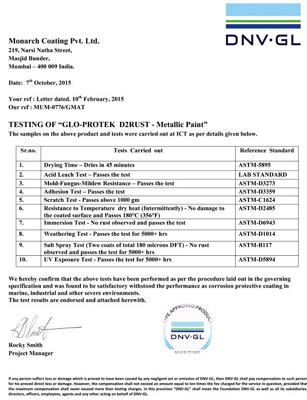 Glo-Protek D2Rust passes 5000+ hr salt spray test, adhesion and other tough tests which result to World's one of the highest durable Anti-Corrosive and Protective Coat.